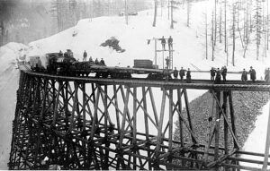 Track laying crew and equipment on the Mosquito Creek Bridge in Cascade Mountains. (caption from Yakima Memories, Jack Gibson photo) From Ironhorse Railroad Park (same picture ) handwritten on photo “Track laying………………Mosquito Creek Bridge” Jack Gibson is looking south-east at the east entrance of Bridge 1. Andrew Gibson, Yakima Valley Museum